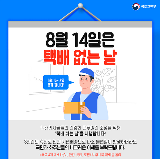 CJ대한통운, 롯데글로벌로지스, 한진, 로젠 등 국내 주요 택배사 4곳은 앞서 지난해에 8월 14일을 ‘택배 쉬는 날’로 정례화하는 내용의 공동선언문을 발표한 바 있다.