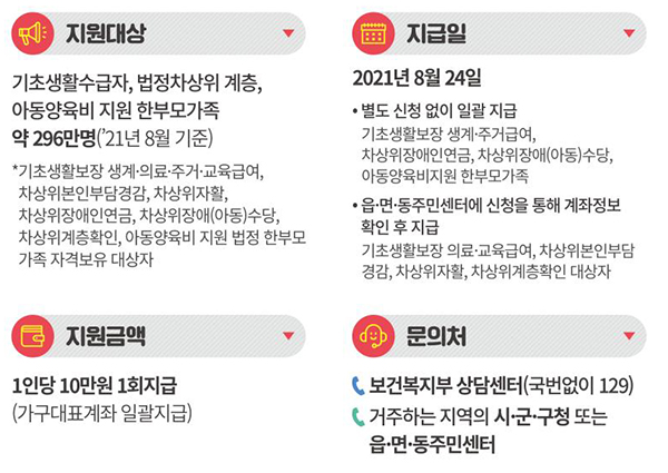 정부가 24일 저소득층 296만 명에게 1인당 10만 원씩 추가로 기존 복지급여 계좌를 통해 국민지원금을 지급한다.