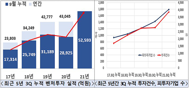 3분기 누적 벤처투자는 지난해 같은 기간보다 81.8% 증가(2조 3668억원)해 역대 최초 5조원을 돌파했다. 3분기 벤처투자 실적은 2조 678억원으로 단일 분기 최초 2조원을 돌파하면서 역대 분기 최대실적을 달성했다.