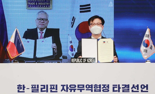 여한구 산업통상자원부 통상교섭본부장과 라몬 로페즈(Ramon M. Lopez) 필리핀 통상산업부 장관은 이날 한-필리핀 자유무역협정(이하 ‘FTA’) 협상이 타결됐음을 선언하고 공동선언문에 서명했다.