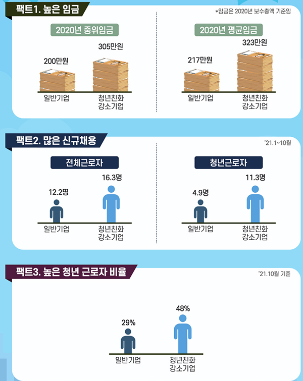 가령 청년친화강소기업의 지난해 중위임금은 305만원이며 평균임금은 323만원으로, 일반기업에 비해 각각 105만원과 106만원이 많아 임금수준이 높았다.