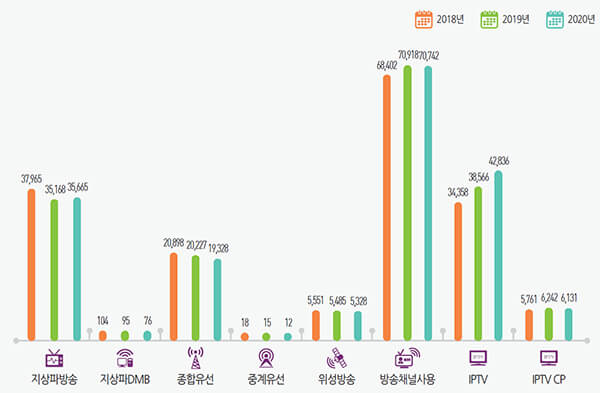 방송분야 종사자 수는 3만 7000여 명으로 전년대비 420명이 감소(-1.1%)했다. 사업자별 종사자 수는 지상파 1만 3827명(-631명, 전체의 37.2%), 유료방송 6014명(+161명, 전체의 16.2%), PP 1만 7249명(+68명, 전체의 46.5%)으로 나타났다.