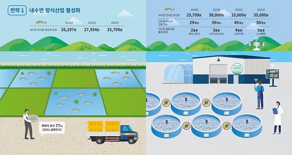 이 밖에도 내수면 양식장, 저수지, 인공산란장 등 내수면 생산지와 유통·가공시설, 지역별 관광상품을 연계해 내수면 어업에서 새로운 부가가치를 창출한다.