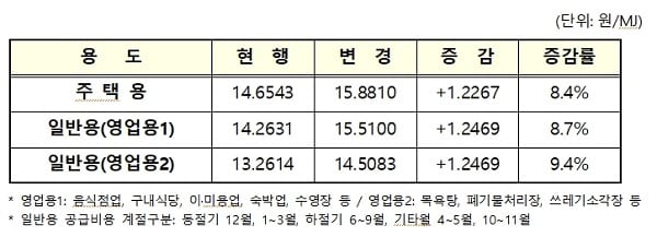 다음 달부터 도시가스 민수용(주택용·일반용) 요금이 8.4~9.4% 인상돼 연중 가구당 평균 가스요금은 월 2450원 증가할 것으로 예상된다.