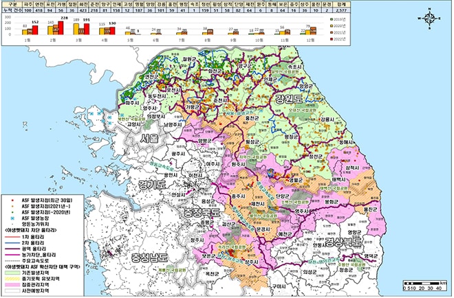 2019년 10월부터 이달 1일까지 약 2년 6개월 동안 아프리카돼지열병(ASF)에 걸린 것으로 확인된 야생멧돼지는 총 2577마리인 것으로 조사됐다고 국립야생동물질병관리원이 3일 밝혔다.