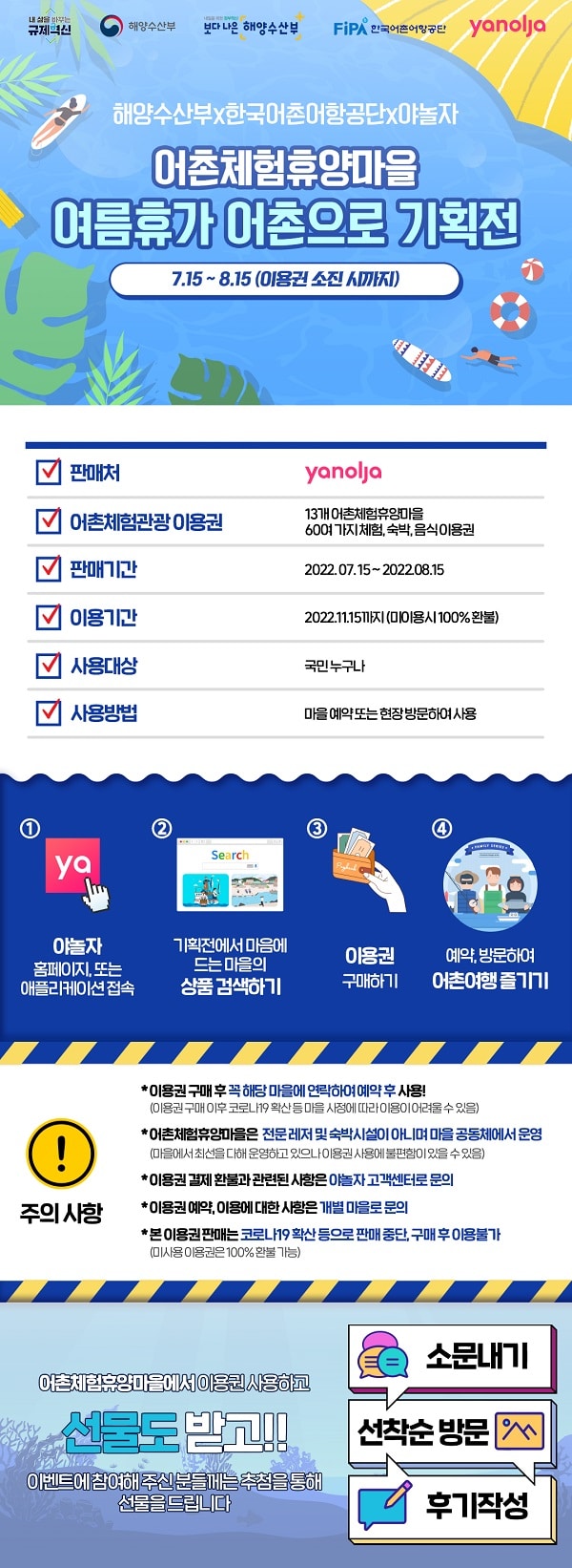 이번 기획전을 이용하고자 하는 사람은 ‘야놀자’를 통해 어촌체험관광 온라인 이용권을 구매한 후 마을 현장에 방문해 제시하면 된다. 사용하지 못한 온라인 이용권은 오는 11월 15일에 전액 환불된다.