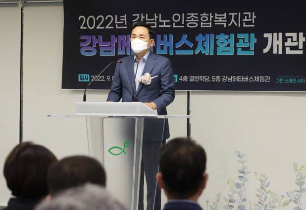 ‘그린 스마트 시티’ 강남구(구청장 조성명)가 강남구립 강남노인종합복지관 5층에 어르신을 위한 IT공간인 ‘강남 메타버스 체험관’을 이달 8일 개관했다. 개관식에 참가한 조성명 강남구청장은 가상현실(VR)체험관에서 증강현실(AR)체험관’에서 구민들과 함께 모션 인식 게임을 함께 했다.