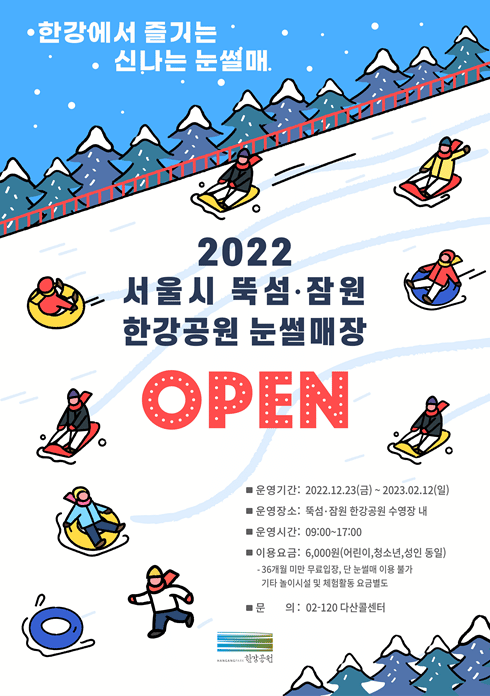 서울시 한강사업본부는 12월 23일(금) 09시 뚝섬·잠원한강공원 눈썰매장을 동시 개장하고 운영을 시작한다고 밝혔다.