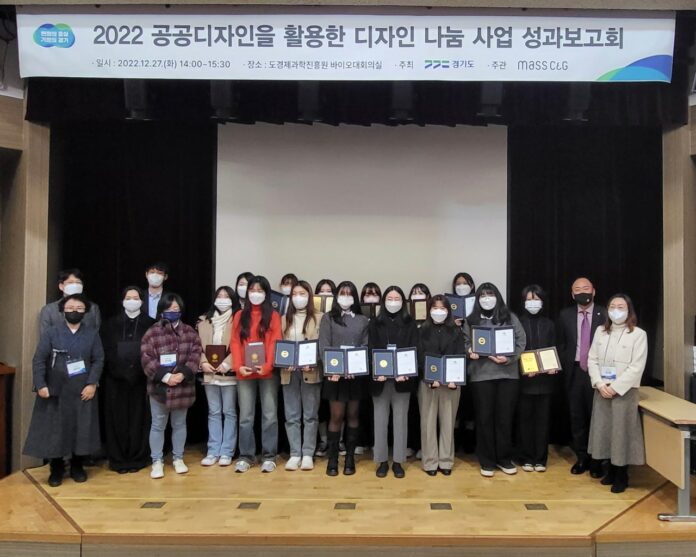 경기도가 27일 경기도경제과학진흥원에서 홍지선 경기도 도시주택실장, 이영희 경기도의회 의원, 수탁기관 디자인전문기업 ㈜매스씨앤지, 동서울대·신한대·한양대 교수 및 대학생, 디자인 전문회사(디토, 디자인미창), 경기도립노인전문병원 관계자 등 60여 명이 참석한 가운데 ‘2022 디자인 나눔 성과보고회’를 개최했다.