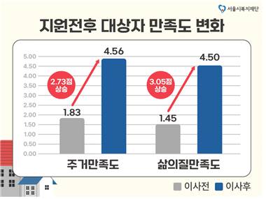 또한, 2022년 지원 가구의 주거만족도는 1.83점에서 4.56점으로 2.73점 상승하였으며, 삶의 질 만족도는 1.45점에서 4.50점으로 3.05점 상승한 것으로 나타났다.