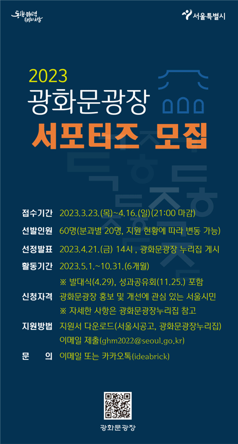 시민 서포터즈 모집 기간은 공고일인 3월 23일(목)부터 4월 16일(일) 21시까지이며, 광화문광장 대표메일(ghm2022@seoul.go.kr)로 우대 사항 증빙서류를 첨부해서 접수하면 된다. 모집에 관한 자세한 내용은 서울시 누리집 서울소식(공고▷고시공고)란이나 광화문광장 누리집 광장나들이 및 공지사항에서 확인해, 지원서를 내려받으면 된다.