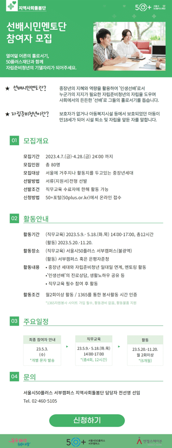 서울시50플러스재단(이하 재단)은 7일(금)부터 50+포털을 통해 자립준비청년(보호종료아동)들이 스스로의 힘으로 사회에 안착할 수 있도록 선배 시민으로서 도움을 줄 중장년 ‘선배시민멘토단’을 모집한다.