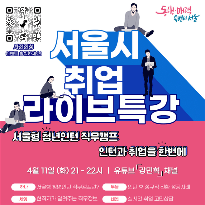 서울시는 서울형 청년인턴 직무캠프 참여 후 <직무교육-인턴십-정규직 전환>에 이르는 취업의 전(全)과정 후기를 생생하게 공유해줄 취업 선배와의 라이브 특강을 4월 11일(화) 밤 9시부터 진행한다고 밝혔다.