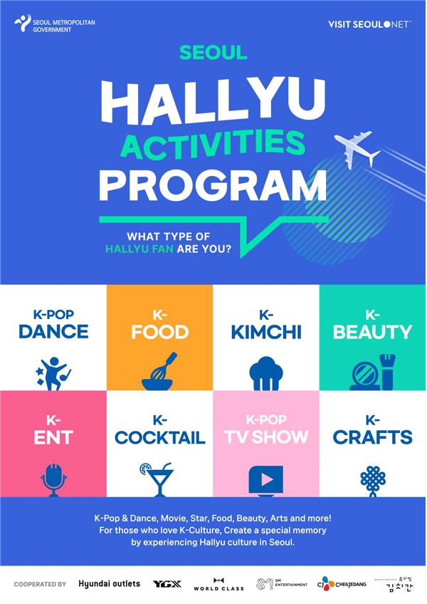 대중문화 주제의 ▴K뷰티 한류스타 메이크업 ▴K팝 댄스 클래스 ▴K엔터테인먼트 도슨트투어 3개와 한국 전통 식문화를 경험할 수 있는 ▴K칵테일 ▴K푸드 쿠킹클래스 ▴김치박물관 투어 3개를 합쳐 총 6개 테마가 운영된다.
