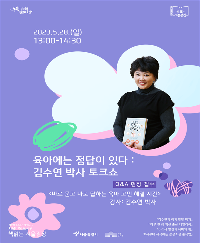 서울시 대표 문화명소로 떠오른 ‘열린 야외도서관’ <책읽는 서울광장>이 5월 28일(일) 오후 1시에 엄마아빠의 행복한 육아를 돕는 김수연 박사의 특별 강연 프로그램을 마련했다. “육아에는 정답이 있다”를 주제로 오후 13시부터 14시 30분까지 90분간 강연을 진행한다.