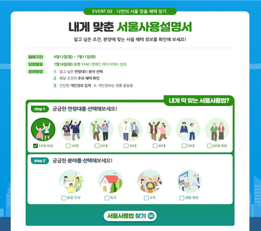 먼저, ‘생애주기로 알아보는 서울사용설명서’ 이벤트에서는 영유아, 아동‧청소년, 청년, 출산‧보육, 중장년, 어르신 등 생애주기별로 서울시가 추진하는 주요 정책을 단계별로 한 눈에 볼 수 있다.