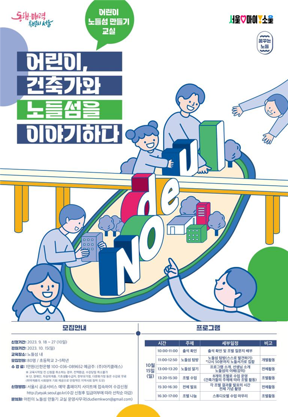 미래 세대 주인공인 어린이들과 미래의 노들섬에 대한 상상력을 펼칠 기회가 생겼다. 서울시가 10월 15일 노들섬에서 “어린이들이 만드는 미래 노들섬” 이라는 주제로 어린이 노들섬 만들기 교실을 열어 어린이들에게 건축교실 체험 기회를 제공할 계획이다.