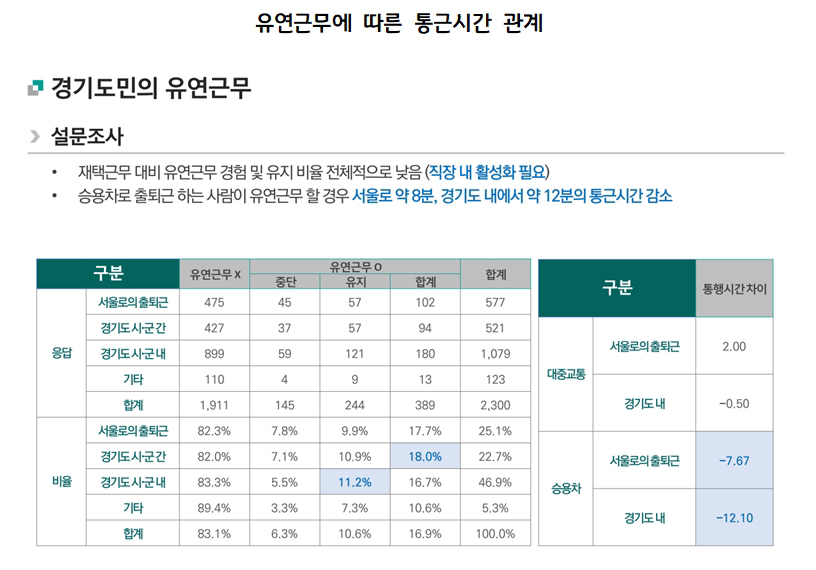 이와 함께 2023년 9월 20~27일 만 25~59세 경기도에 거주하는 직장인 2천300명을 대상으로 코로나 기간 중 업무행태 변화와 출퇴근 교통행태 변화에 대한 인식조사를 실시했다.
