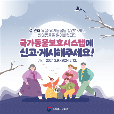 한편, 지난 추석 연휴에 이어 이번 설 연휴에도 ‘연휴 기간 운영하는 응급 동물병원’의 정보를 농식품부 공식 누리집 및 국가동물보호정보시스템에 게시한다. 지역별로 운영하는 동물병원의 명칭·주소와 운영 날짜를 확인할 수 있으며, 약 450개 동물병원이 이번 설 연휴에도 운영을 지속한다.