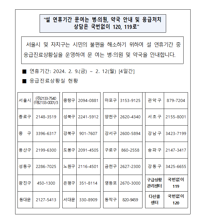 □ 연휴 기간 ‘문 여는 병·의원, 약국’에 대한 정보는 서울시 ‘2024 설 연휴 종합정보’ 누리집(www.seoul.go.kr/story/newyearsday) 및 25개 자치구 누리집, ‘응급의료포털(www.e-gen.or.kr)’에서 확인할 수 있다. 전화는 국번없이 120(다산콜센터), 119(구급상황관리센터)로 연락하면 되며, 모바일 앱 ‘응급의료정보제공(e-gen)’에서도 확인이 가능하다.